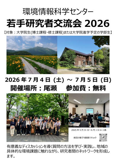 今年も「若手研究者交流会」(大学院生・大学院進学予定の学部生対象)を開催いたします。前回の三島市 (動画で様子をご覧いただけます)につづき、今年は尾瀬での開催となります。